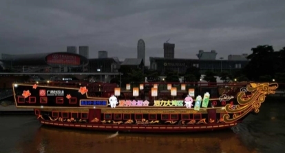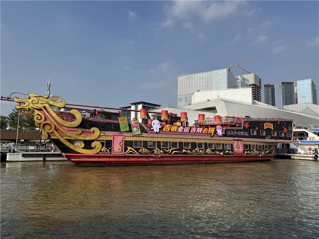 “王老吉·全运主题船”由“南海神·广州日报号”华丽升级改造而成。这艘于2006年为迎接瑞典仿古商船“哥德堡号”重访广州而生的游船,借全运会东风,再度以全新面貌引领珠江。作为珠江上最先以全运会为主题实施全面升级改造的游船,该船以“吉情全运,吉刻去拼”为主题,船身精心装饰全运会口号、吉祥物“喜洋洋”“乐融融”,以及木棉花、王老吉全运特别款产品造型,尽显全运活力与岭南风情。室内设有“王老吉百年茶铺”、“云山珠水·宫灯映华”联动主题展、全运倒计时墙和岭南风情打卡点,将全运精神、岭南文化与珠江美景巧妙融合。